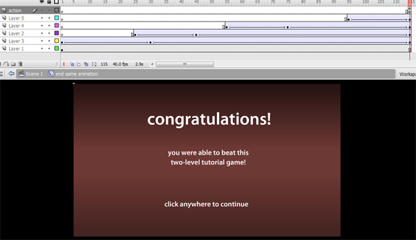 So what is a game without a proper ending? For this tutorial we add an animation after winning the second level letting the player know he/she has won and at the end the screen becomes clickable and can take you back to the main menu.