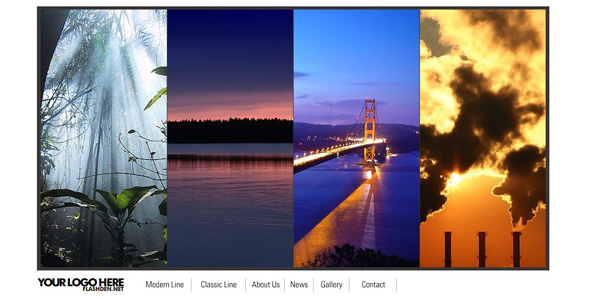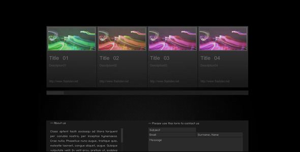 A web site template without any use of XML data. It is all done with tweening and a bit of ActionScript. Note that it is only 151kb in size. All the images and text are changed easily.