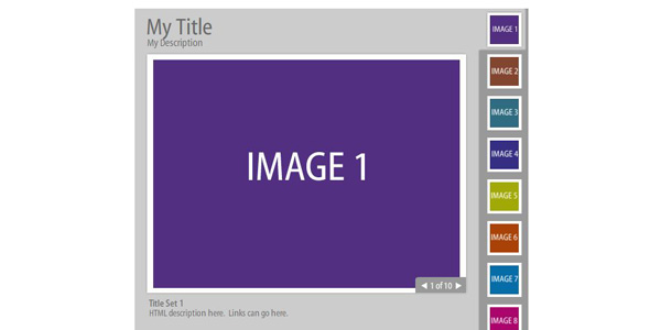 Simple gallery page with vertical thumbnail panel. Users can adjust the color of the text, background, and side panel.