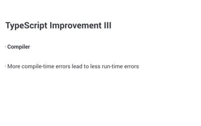 Hi and welcome back to TypeScript Fundamentals. In this lesson, I'm giving you an introduction about what TypeScript really is and how it relates to the classic JavaScript. TypeScript is developed and maintained by Microsoft. It was first released in October 2012. TypeScript was intended for large scale web applications. These are based on JavaScript. So what makes it better? Well, first of all, TypeScript is just a superset of JavaScript. This means that any valid JavaScript code is also valid TypeScript code, then there are three major areas where TypeScript aims to improve JavaScript. The first concept is the one of strong typing, also known as static typing. If you come from languages like Java or any C-like language, you already know what this is. Strong typing requires you to specify a type for every variable or parameter you define and it ensures that only this type is used during a compilation step called type checking. This feature is optional in TypeScript, so you don't have to use it, but it makes debugging a lot easier. If the compiler can help you avoid mistakes, because of a wrong type. The second enhancement TypeScript makes to JavaScript is the extension of object-oriented functionality like clauses, interfaces, generics and so on. Some of those features though, they creep into newer versions of the ECMAScript specification. But on to browser support them and user's upgrade to a newer browser versions, it takes time, a lot of time. Especially big companies are very, very reluctant to upgrade to new possibly untested versions of web browsers. In grouping number three is the fact that by using a compiler and strict to constraints in typing, you can catch errors at compile-time instead of run-time which is usually the case with interpreted languages like JavaScript, Ruby or Python. With interpreted languages, you have the problem that until you run a certain piece of code, you don't know how it behaves or if there is an error beforehand. I've called it a compiler so far, because that is the much more common term for transforming a piece of code into another one. But technically, the word transpiler would be more appropriate. It is used when the compilation is from an input language that is very similar to the output language. So if you see the terms transpiling or transpiler somewhere, you now know that this basically means the same as compiling or a compiler. Of course, if you use a strongly typed language and want to integrate it with popular libraries like JQuery, MongoDB, D3 or even basic modules, you can run into problems when there is no type information available for them as they are written in plain old JavaScript. Much like in other languages like C++, you can have header files that define types for those, so you are all set. As you can see, there are a couple of advantages to using plain old JavaScript, especially when using TypeScript in a bigger project that uses a packager like web pack. Of course, with ECMAScript evolving every year, the differences get smaller over time, although static typing will at least take a couple of years until it will be added to the specification. To recap, TypeScript is a superset of JavaScript. It supports strong or static typing for variables, function parameters and return values. TypeScript extends JavaScript's object-oriented capabilities. By having compile time errors, less run-time errors should occur. Because of the jacks, the compiler makes you run this step. Now it's time to install the TypeScript compiler and write our first TypeScript program. We will do that in the next lesson. See you there.