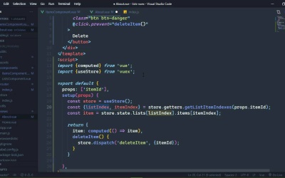 In this lesson, we are going to add the ability to navigate to a separate page, so that we can view the detail of an item. Now, I know that there's not a lot of detail about an item, but this will give us the opportunity to add more functionality, such as deleting an item. And we can see how we can incorporate Vuex throughout this whole process, so let's just dive in and begin by adding a link. Now, we're going to do this for our item text, and we are going to use the view router for our navigation because that's what we should do. And we are going to reuse the about view, because it was already given to us and we might as well use it. So we are going to navigate to about, and then the id is going to be the second segment there. So we will need to modify our router. But first, this is going to make our UI a little ugly. That's very difficult to see. So let's add some styling to our link here. And in fact, we can just reuse the text classes that we applied to our card. So let's just copy that, we will add that to our router link. And we don't need the background values, so we will just leave the text values and that's a whole lot better. So let's go to our router file, and there's just a few changes that we need to make. For one, we need to specify that we are going to have an id as the second segment to this path. And we will also go ahead and add props here, because we want to be able to get the id. And of course, we can get the id using the view router. But why I do that, when we can just go ahead and make it a prop here. So we will have a prop called itemid, and that is simply going to be from our route, we'll get the id from params there. Now, do note that this is going to be a string value, because this is coming from the URL. So really what we want to do is parse this as an integer, so that we can use it as a numeric value. So there we go, that is going to be our route. So that's inside of our about view. Let's go ahead and open that up, let's add our scripts. I'm going to once again, use the composition API so that we can get our props as an argument to our setup method. Let's also go ahead and pull in the import statements for computed and useStore, because we will need access to those as well. And then we need our store, so let's go ahead and call useStore. Now, we have some options here as far as displaying the item that we want to display. We could come in here and we could say that, okay, we'll take our store we will commit something like selected item id, kind of like what we did with the lists. And then we could pass in the item id from our props, although we do need to specify that we have that prop, don't we? So, let's quickly do that [LAUGH] or nothing is going to work there. Okay, so we could do that, however, if we are going to set the currently selected item, then that pretty much means that we can't view multiple items at the same time by just opening them up in their own tabs. And I don't know about you, but I have a lot of tabs open usually. So we can't really track which item we currently are looking at, otherwise, we would run into some Issues whenever we try to delete or update an item. So about vues are going to have to be pretty much self-contained. We aren't going to be setting any state, but we'll definitely need to access our state, so that we get the item that we need to display. And we already know how to get the information that we need to get the item. We have it's id, but we do need the listIndex and the itemIndex, and we know how to do that. We wrote a getter specifically for that purpose, it's called getListitemIndexes. Then we supply the item id from our props, and that will give us our information, so that then we can just retrieve our item. Once again, we have to get into our store access the state, but then for our lists, we will provide the List index and then for our items, the item index that will give us our items, so that then we can make it available to our template. Now, this needs to be a computed value, so that it is reactive. So we will just simply wrap our item with the call to computed, and there we go. So inside of our template for this h1, let's make this our text for the item. So if we go to the browser and view each one of these pages, we should see the text Strat, Tele and Les Paul, and Vela. So that part is good to go. Now, we need to add the button for deleting an item. So let's go ahead and do that. Let's use the button danger class, because we are deleting something, we want this to be somewhat of a warning. And as far as the method is concerned, let's just call it delete item. Because really, we have all the information that we need inside of our setup method here, so we don't really need to pass anything. So we'll just have delete item, and then inside this method the we, of course, want to dispatch inaction which I guess, we could just call delete item as well and then we could just pass in item it. Now, we could probably pass in the listIndex and the itemIndex, because we are going to have to do the same thing inside of this action. However, I want to make it so that we retrieve that information fresh every time that we need it because this could be stale, there could be some side effects thanks to reactivity and all of that stuff. Especially after we remove an item, then the indexes are gonna be different, and there could be some issues. So I would prefer to err on the side of caution, and just retrieve the information that we need right whenever we need it. So in this case, we will have that delete item action. We of course will need to commit some changes, and we will have our item id. Now, ery first thing that we need to do is make our http request. So we will make a delete request, and the endpoint will be items slash and then the item id. But after that, then we of course want to update our state. And this is where we essentially want to call that getter function once again. So let's just copy the code that we have 