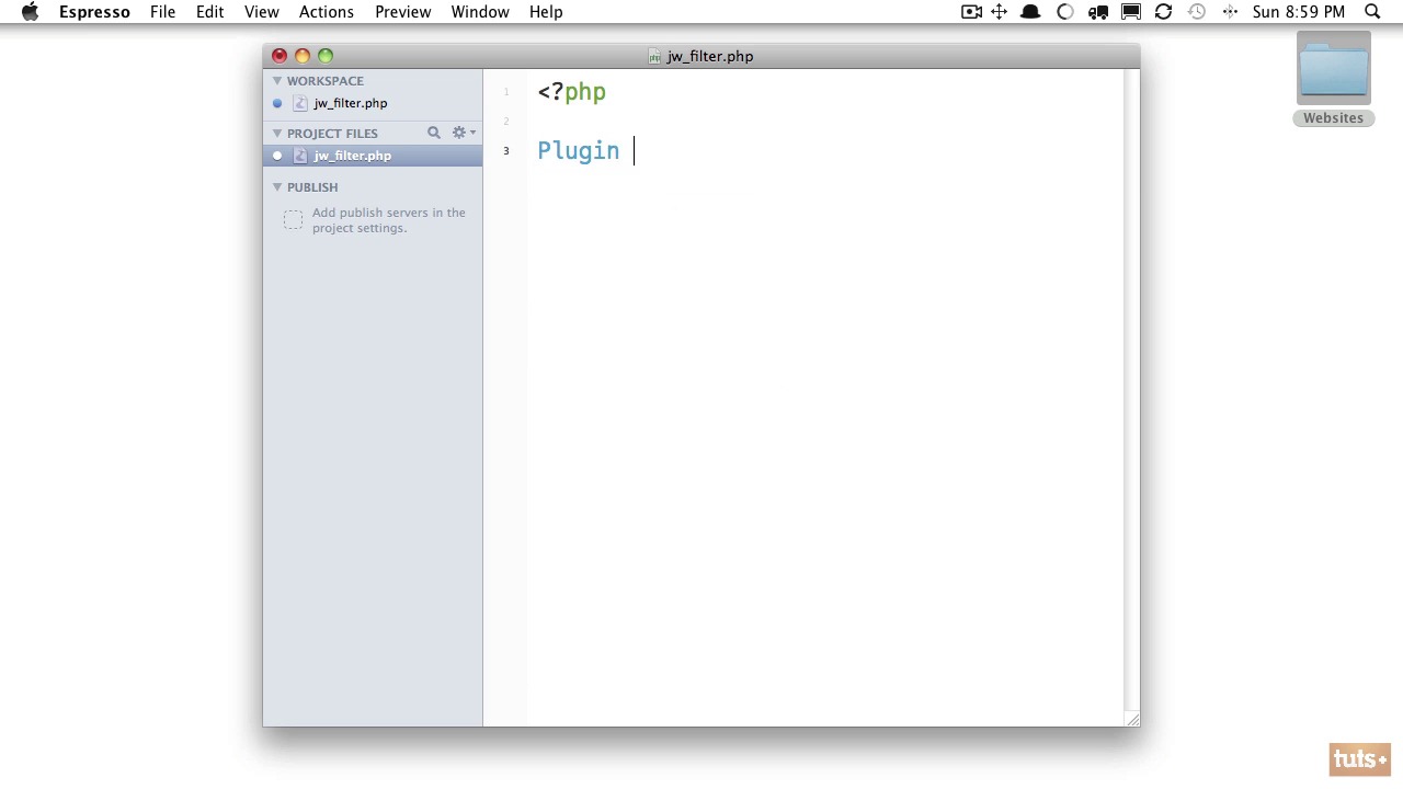 In the early days of WordPress, if you wanted to modify the course functionality of WordPress, you’d need to edit those core framework files. Now, of course, the problem with this was whenever the WordPress team would release an update to the framework, you’d lose all of your updates. At that point, you were left with two options: 1) Never updated. 2) Lose all of your modifications and start from scratch. Luckily now, with WordPress hooks – action hooks and filter hooks – we can modify the behavior of WordPress without having to touch any of those core files. I’m going to give you a crash course in working with these. First, we need to create a new plugin. Access your WordPress project site, browse to WP-Content -> Plugins, and create a new folder, called JWFilter. Next, drag that folder into your code editor of choice. Next, create a new file, and give it the same JWFilter.php name. Now, we must left WordPress know that this file is, in fact, a plugin. To do so, we need to add some comments to the very top.